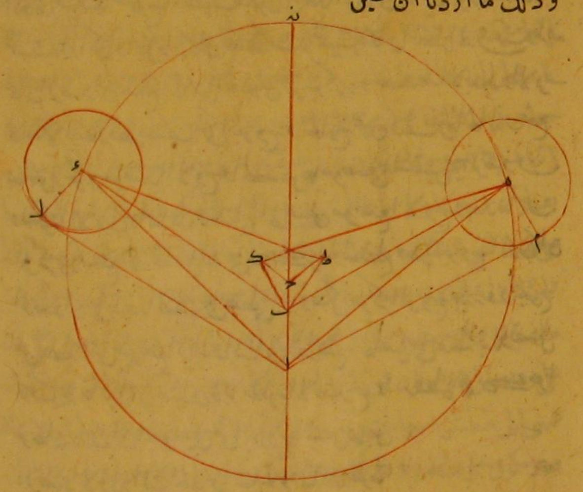 ليكن الخطّ المارّ بالمراكز والأوج البطيء الحركة ا ب ج ن وليكن ا مركز البروج وب مركز معدّل المسير وج مركز المدير ونخرج ب د ب ه يحيطان مع ج ب بزاويتين متساويتين ونخرج خطّي ج ط، ج ك يحيطان مع ج ز بزاويتين متساويتين ومساويتين لزاويتي د ب ج، ه ب ج فيوازيان خطّي ب ز ب ه ويفصل كلّ واحد من خطّي ج ط، د ك مثل ج ب وندير على مركز ط الفلك الحامل حال كون التدوير في جهة خطّ ب د وليفصل خطّ ب د على د فندير على د فلك تدوير عليه ل، وكذلك ندير على ك الحامل أيضًا، نقطع خطّ ه ب على ه وندير على ه تدویر م مساويًا لتدوير ل ونصل ط د، ك ه فيكونان متساويين لأنّهما نصفا قطري الحامل ونصل ا د ا ه ونخرج من مركز البروج خطّي ا ل، ا م يماسّان تدويري ل، م على نقطتي ل، م ونصل د ل ه م، فأقول إنّ زاويتي ب د ا، ج ا One geometrical letter of the second angle is missing. متساويتان وهما زاويتا اختلاف لسبب مسير مركز التدوير و إنّ زاويتي د ا ل، ه ا م متساويتان وهما غايتا الاختلاف الكائن لسبب فلك التدوير. برهان ذلك أنّا نصل خطّي ب ط ز ك فلأنّ زاويتي ط ج ب، ك ج ب متساويتان وضلعا ج ط، ج ك متساويتان وضلع ب ج مشترك تكون قاعدة ب ط مثل قاعدة ب ك، فزوايا مثلّثي ط ج ب، ك ج ب متساوية لزاوية ك ب ج فتكون نسبة ط د إلى ط ب من مثلّث د ط ب كنسبة ه ك إلى ك ب من مثلّث ه ك ب، وكلّ واحدة من زاويتي ب د ط، ب ه ك حادّة فبيّن الحال في إحديهما لظهور حال الثانية فيها، فنقول إنّ زاوية ب ه ك حادّة لا جائز أن تكون قائمة ولا منفرجة لأنّها لو كانت قائمة أو منفرجة لكان وترها أعظم من كلّ واحد من الضلعين المحيطين بها ولكان محيط الحامل الذي مركزه نقطة ك يقطع خطّ ك ب فيقطع خطّ ب ن فيقع مركبة العالم خارجًا عن محيط الحامل فلا يكون الحامل حاملاً بل فلك تدوير وهو محال ويلزم المحال أيضًا حين يكون مركز الحامل نقطة ط فزاويتا ب ه ك، ب د ط حادّتان فمثلّثا د ط ب متساويا الأضلاع فضلع ب د مساو لضلع ب ه وضلع ب ا مشترك وزاوية ا ه ب مساوية لزاوية ا ب د فقاعدة ا د مساوية لقاعدة ا ه فزاوية ا د ب مثل زاوية ا ه ب ولأنّ زاويتي ل، م قائمتان ووتري ب د، ب ه متساويان فمربّعا د ل، ا ل مثل مربّعي ه م، ا م لكن مربّعا د ل، ه م متساويان فمربّعا ا م، ا ل متساويان فخطّا ا ل، ا م متساويان وزاويتا د ا ل، ه ا م متساويتان وذلك ما أردنا أن نبيّن.