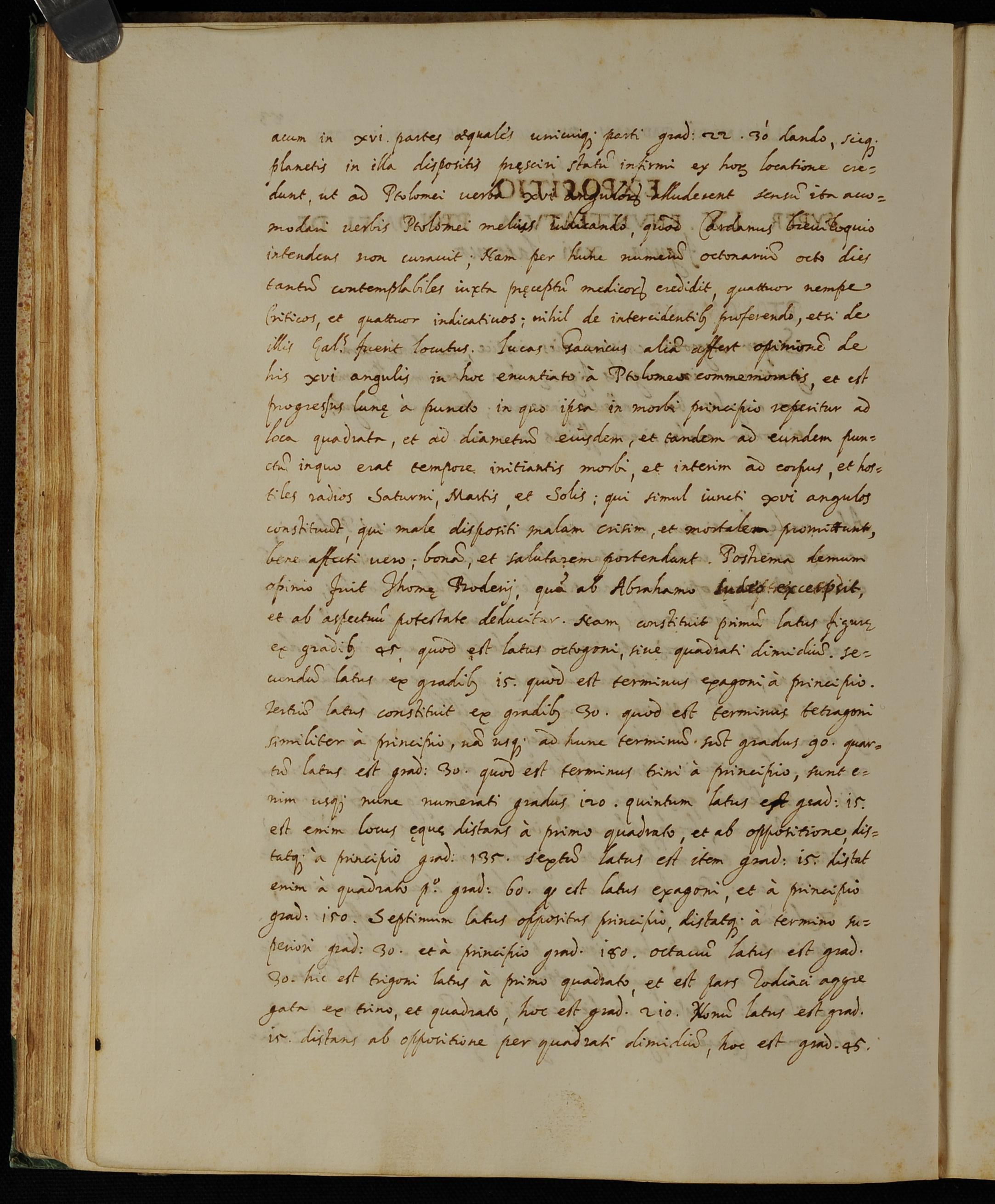 cum in XVI partes aequales unicuique parti gradus 22 30′ dando sicque planetis in illa dispositis praesciri statum infirmi ex horum locatione credunt. Ut ad Ptolomei verba XVI angulorum alluderent, sensum ita accomodari verbis Ptolomei melius iudicando, quod Cardanus Breviloquio intendens non curavit. Nam per hunc numerum octonarium octo dies tantum contemplabiles iuxta praeceptum medicorum credidit, quattuor nempe criticos et quattuor indicativos, nihil de intercidentibus proferendo, etsi de illis Galienus fuerit locutus. Lucas Gauricus aliam affert opinionem de his XVI angulis in hoc enuntiato a Ptolomeo commemoratis. Et est progressus Lunae a puncto, in quo ipsa in morbi principio reperitur, ad loca quadrata et ad diametrum eiusdem et tandem ad eundem punctum, in quo erat tempore initiantis morbi, et interim ad corpus et hostiles radios Saturni, Martis et Solis. Qui simul iuncti XVI angulos constituunt, qui male dispositi malam crisim et mortalem promittunt, bene affecti vero bonam et salutarem portendunt. Postrema demum opinio fuit Thomae Proderii, quam ab Abrahamo Iudaeo excerpsit et ab aspectuum potestate deducitur. Nam constituit primum latus figurae ex gradibus 45, quod est latus octogoni sive quadrati dimidium, secundum latus ex gradibus 15, quod est terminus exagoni a principio. Tertium latus constituit ex gradibus 30, quod est terminus tetragoni similiter a principio. Nam usque ad hunc terminum sunt gradus 90. Quartum latus est gradus 30, quod est terminus trini a principio. Sunt enim usque nunc numerati gradus 120. Quintum latus est gradus 15. Est enim locus aeque distans a primo quadrato et ab oppositione distatque a principio gradus 135. Sextum latus est item gradus 15. Distat enim a quadrato primo gradus 60, quod est latus exagoni et a principio gradus 150. Septimum latus oppositus principio distatque a termino superiori gradus 30 et a principio gradus 180. Octavum latus est gradus 30. Hic est trigoni latus a primo quadrato et est pars zodiaci aggregata ex trino et quadrato. Hoc est gradus 210. Nonum latus est gradus 15 distans ab oppositione per quadrati dimidium. Hoc est gradus 45.
