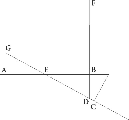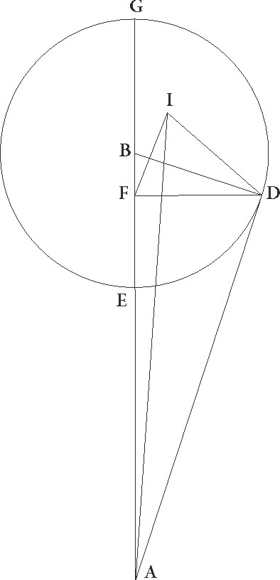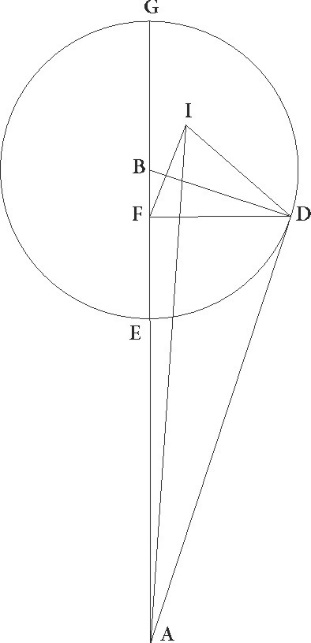Sit ergo rursum ABG linea circuli per medium signorum et epicycli communis sectio, descriptoque in B puncto epiciclo GDE obliquo obliquo] corr. ex obliqo G ad superficiem circuli per medium, ut iam explanavimus, coniungatur a centro zodiaci A tangens epicyclum linea AD, et protrahantur a puncto D, et ad lineam quidem GBE perpendicularis DF, ad superficiem autem circuli per medium perpendicularis DI, et coniunguntur BD et FI et AI linee, et supponatur DAI angulus continere in utraque stella medietatem proposite remotionis secundum longitudinem que medietas est talium 2 30′ qualium quatuor recti sunt 360, sitque propositum invenire magnitudinem obliquationis utriusque superficierum, hoc est magnitudinem anguli DF.