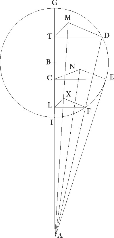 sunt angulorum, et anguli qui fiunt in punctis M N X recti sunt. Quare linea NE ad lineam EA maiorem habet proportionem quam utraque linearum MD et XF ad utranque DA et FA, suntque rursum anguli DMA et ENA et FXA recti. Maior igitur est etiam EAN angulus angulo DAM ceterisque videlicet omnibus qui eodem modo constituuntur. Perspicuum autem hinc est quod differentiarum que fiunt ex obliquatione in additionibus subtractionibusve secundum longitudinem maior illa ceteris est que colligitur in motibus maximis qui fiunt in puncto E, propterea quod ipsas anguli continent quibus subtenduntur TD et CE et LF linearum excessus ad lineas TM et CN et LX. Cum vero in singulis ipsarum eadem proportio maneat et ad excessus, sequitur ut excessus etiam EC et CN linearum maiorem proportionem habeat ad lineam EA quam ipsi excessus reliquarum ad lineas similes linee AD, AD] iter. et del. G hinc etiam patet quod, quamcunque proportionem maxima additio subtractiove secundum longitudinem ad maximum latitudinis motum habuerit, hanc in omnibus epicycli particulis additiones subtractionesve secundum longitudinem ad motus latitudinis habebunt, propterea quod sicut se habet CE linea ad lineam EN, sic omnes linee similes lineis LF et TD ad similes lineis FX et DL.