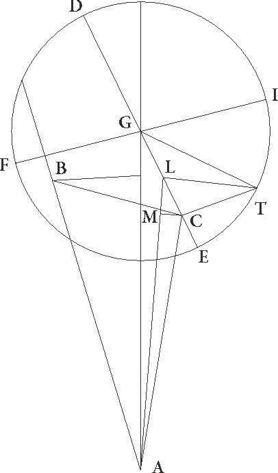 Describatur rursus figura declinationum demonstratas in stella Iovis continens proportiones, ut qualium est semidiameter epicycli 11 30′, talium utraque linearum GC et CT colligatur 8 8′. Quoniam ergo AGE angulus declinationis epicycli talium supponitur 2 30′ qualium quatuor recti sunt 360, qualium vero duo recti sunt 360, talium 5, erit etiam arcus linee EM talium 5 qualium est circulus qui rectangulo GCM circumscribitur 360, arcus vero linee GM 175 ad semicirculum reliquorum. Corde igitur etiam sue CM quidem talium erit 5 14′, qualium GC que rectum subtendit 120, et GM 119 53′. Quare qualium est GC linea 8 8′ et AG linea longitudinis que in principio Libre fit 62 30′, talium etiam CM erit 0 21′ et GM 8 8′ similiter, et reliqua MA 54 22′, et propterea etiam AC que rectum