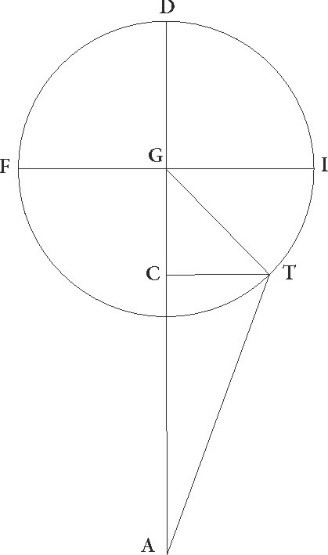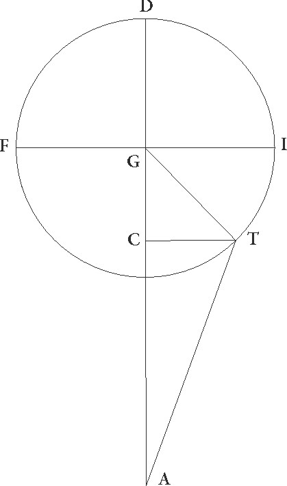 Sed collationis etiam additionum subtractionumve longitudinis causa sine declinationibus figura rursum describatur. describatur] corr. ex describitur G Et quoniam in proposita distantia, qualium est utraque linearum TC et GC 8 8′, talium tota quoque AG 57 30′, et reliqua AC 49 22′ earundem, et quadratum suum cum quadrato linee TC facit quadratum linee AT, habebimus huius quoque longitudinem earundem 50 et sexagesimarum duarum. Quare qualium est AT que rectum subtendit 120, talium etiam TC erit 19 30′, et TAC angulus additionis subtractionisve secundum longitudinem talium 18 42′ qualium duo recti sunt 360, qualium vero quatuor recti sunt 360, talium 9 21′. Fuit autem in declinationibus 〈e〉tiam etiam] atiam A demonstratus 9 22′, addidit ergo rursum additio subtractiove secundum longitudinem propter utrasque declinationes sexagesimam unam.