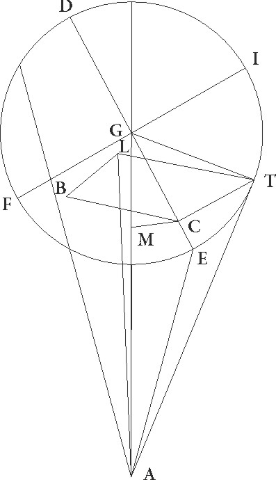In maxima vero declinatione que in semicirculo minime longitudinis est, quoniam AG linea distantia que in principio Arietis est talium colligitur 57 40′ qualium CM 0 22′ demonstrata est, et GM similiter 4 35′, atque ideo reliqua AM sit 53 5′ et AC que rectum subtendit, quoniam indifferenti quodam maior est quam AM, 53 5′, erit etiam CM talium 0 50′ qualium est AC que rectum subtendit 120, et angulus CAM talium 0 48′ 48'] corr. ex 848 G qualium duo recti sunt 360. Eorundem vero etiam angulus BAG supponitur 5, et totus igitur BAC talium est 5 48′ qualium quatuor recti sunt 360. Quare arcus quoque linee BC talium erit 5 48′ qualium est circulus qui BAC rectangulo circumscribitur 360. Arcus vero linee AB 174 12′ ad semicirculum reliquorum. Corde igitur etiam sue BC quidem talium erit 6 4′ qualium est AC que rectum subtendit 120, et AB 119 51′ earundem. Quare qualium est AC linea 53 5′, talium etiam BC erit 2 41′ et AB 53 1′. Et quoniam quadratum linee AB cum quadrato linee BL facit quadratum linee AL, demonstrataque est linea BL 4 36′ earundem, habebimus etiam longitudinem linee AL 53 13′ earundem. Quare qualium est AL que rectum subtendit 120 talium etiam BL erit 10 23′ et BAL angulus additionis subtractionisque secundum longitudinem talium 9 56′ qualium duo recti sunt 360, qualium vero quatuor recti sunt 360 talium 4 58′. Rursus quoniam qualium est AL linea 53 13′, talium etiam TL, cum sit equalis linee BC est 2 41′, et quadrata istarum simul faciunt quadratum linee AT, habebimus huius quoque longitudinem 53 17′ earundem. Quare qualium est AT que rectum subtendit 120, talium TL quoque erit 6 3′, et TAL angulus remotionis secundum latitudinem talium 5 46′, qualium duo recti sunt 360, qualium vero quatuor recti sunt 360, talium 2 53′, quos etiam gradus in quarto eiusdem tabule ordine ad numerum graduum 135 apponemus.