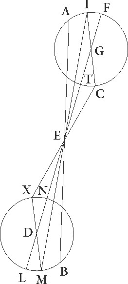 Sit enim in superficie que recta est ad circulum per medium signorum communis ad ipsam sectio superficiei quidem circuli per medium AB linea, superficiei vero excentrici linea GD, zodiaci autem centrum sit E, describanturque in communi super〈fi〉cierum superficierum] supercierum A sectione in IG maxima excentrici et MD minima in subiecta superficie circuli equales FITC et LMNX qui per polos epicyclorum esse supponantur in quibus declinentur epicyclorum superficies tum ad lineam IGC tum ad linem MDX MDX] post corr. G ad equales videlicet videlicet] videlilicet A angulos in G et D punctis factos, et coniungantur a centro zodiaci E in quo visus est ad maximam et minimam epicyclorum longitudinem linee ad maximam quidem EI et EM, ad minimam vero EC et EX, ut C et X puncta motus medio Soli Soli] post corr. G oppositos contineant, puncta vero I et M coniunctionales.