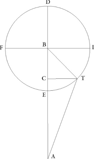 Rursus propter collationem additionis subtractionisque describatur figura absque ulla declinatione. Et quoniam demonstratum est talium esse utranque TC et CB linearum 15 55′ qualium est AB 56 40′ et reliqua AC 40 45′ earundem, quoniamque quadratum AC linee cum quadrato linee CT facit quadratum linee AT, habebimus etiam ipsam talium per longitudinem 43 45′ qualium erat TC 15 55′. Qualium ergo est AT rectum angulum subtendens 120, talium etiam CT erit 43 39′ et CAT angulus additionis subtrationisque longitudinis talium 42 40′ qualium duo recti sunt 360, qualium vero quatuor recti sunt 360 talium 21 20′. Fuit autem demonstrata graduum 21 17′ in declinatione, minor ergo etiam hic additio subtractiove longitudinis tribus unius gradus sexagesimis propter declinationem inventa est.
