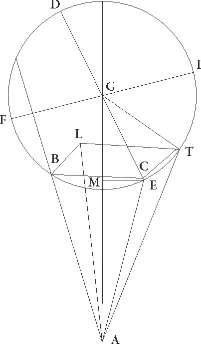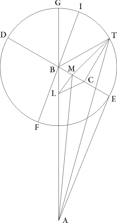 Quoniam igitur arcus ET talium est 45 qualium est epicyclus 360, erit etiam angulus EBT qui est in centro epicycli talium 45 qualium quatuor recti sunt 360, qualium vero duo recti sunt 360 talium 90. Quare uterque arcus BC et CT linearum talium est 90 qualium est circulus qui BTC rectangulo circumscribitur 360. Utraque igitur corda talium est 45 52′ qualium est BT que rectum subtendit 120. Qualium igitur est BT semidiameter epicycli 43 10′ et AB medie distantie 60, in hac enim maxime declinatio epicycli maxima fit, talium erit utraque linearum BC et CT 30 32′. Rursus quoniam ABE angulus declinationis talium supponitur 2 30′ qualium quatuor recti sunt 360, qualium vero duo recti sunt 360, talium 5, erit etiam arcus linee LC talium 5 qualium est circulus qui BLC rectangulo circumscribitur 360, arcus vero linee BL 175 ad semicirculum reliquorum. Corde igitur etiam sue CL quidem talium erit 5 14′ qualium est BC que rectum subtendit 120 et BL 119 53′ earundem. Quare qualium est BC que rectum subtendit 30 32′ et AB linea 60, talium CL quoque erit 1 20′ et BL 30 30′ earundem et AL 29 30′ reliquarum. Est autem etiam LM, cum sit equalis linee CT, 30 32 earundem. Quare AM etiam que rectum subtendit 42 27′ earundem colligitur. Qualium igitur est AM que rectum subtendit 120, talium erit etiam LM 86 19′, et angulus LAM additionis subtractionisve secundum longitudinem in hoc situ talium erit 92 0′ qualium duo recti sunt 360, qualium vero quatuor recti sunt 360, qualium … 360] add. marg. G talium 46 0′.