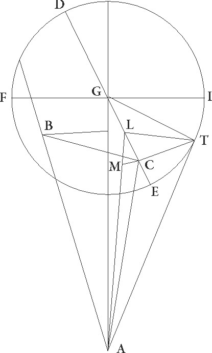 Deinceps propter Martis quoque proportiones designetur primum declinationum descriptio, colligaturque rursum utraque linearum GC et CT talium 27 56′, qualium est GT semidiameter epicicli 39 30′. Quoniam igitur AGE angulus declinationis epicycli talium supponitur 2 15′, qualium quatuor recti sunt 360, qualium vero duo recti sunt 360, talium 4 30′, erit etiam arcus linee CM talium 4 30′ qualium est circulus qui GMC rectangulo circumscribitur 360, et arcus linee GM 175 30′ ad semicirculum reliquorum. Corde igitur etiam sue CM quidem talium erit 4 43′ qualium est GT que rectum subtendit 120, GM autem 119 54′ earundem. Quare qualium est GC 27 56′, et AG maxime distantie linea 66 talium etiam CM erit 4 6′, et GM 27 54′, et AM 38 6′ reliquarum, idcirco AC etiam que rectum subtendit 38 7′ earundem. Quare qualium est AC que rectum subtendit 120, talium CM quoque erit 3 28′, et angulus CAM talium 3 19′ qualium duo recti sunt 360. Sed BAG quoque angulus declinationis excentrici talis unius est qualium quatuor recti sunt 360, qualium vero duo recti sunt 360, talium 2, et totus igitur BAC angulus talium colligitur 5 19′ qualium duo recti sunt 360. Ergo arcus quoque linee CB talium erit 5 19′, qualium est circulus qui BAC rectangulo circumscribitur 360, et arcus linee AB 174 41′ ad semicirculum reliquorum. Corde igitur etiam sue BC quidem talium est 5 34′, qualium AC que rectum subtendit 120, AB autem 119 52′ earundem. Quare qualium est AC linea 38 7′, talium etiam CB erit 1 46′, et AB 38 5′. Est autem BL quoque linea 27 56′, cunque quadratum linee AB cum quadrato linee BL faciat quadratum linee AL, habebimus huius quoque longitudinem 47 14′. Similiter quoniam TL linea 1 46′ earundem est, et quadratum linee AL cum quadrato linee TL facit quadratum linee AT, erit huius quoque longitudo 47 16′ earundem. Qualium ergo est AT que rectum subtendit 120, talium talium] corr. ex qualium G etiam TL erit 4 29′, et TAL angulus remotionis secundum latitudinem talium 4 18′ qualium quatuor recti sunt 360, qualium vero duo recti sunt 360, talium 2 9′, quos gradus in tertio tabule Martis ordine ad numerum 135 graduum apponemus.