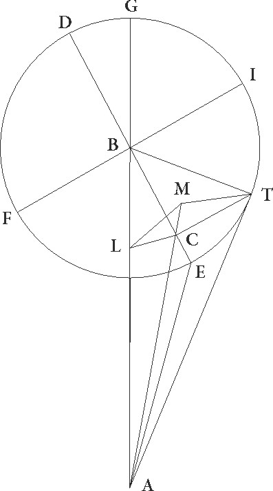 Intercipiatur igitur arcus ET graduum, ut diximus, 45, ducanturque ad lineam quidem BE perpendicularis TC, ad superficiem vero circuli per medium perpendiculares CL et CM, et coniungantur TB et LM et AM et AT linee. Quod igitur LCTM quadrilatera figura paralellogramma et rectangula est, propterea quod CT equidistans est ad superficiem circuli per medium, et quod additionem subtractionemve longitudinis LAM angulus continet, motum vero latitudinis angulus TAM, cum anguli ALM et AMT recti sint, ideo quod AM quoque linea in superficie circuli per medium invenitur, perspicuum est. Nunc autem quanti colliguntur motus quos querimus in utraque dictarum stellarum demonstrandum est, et primum in Venere.