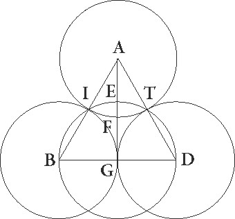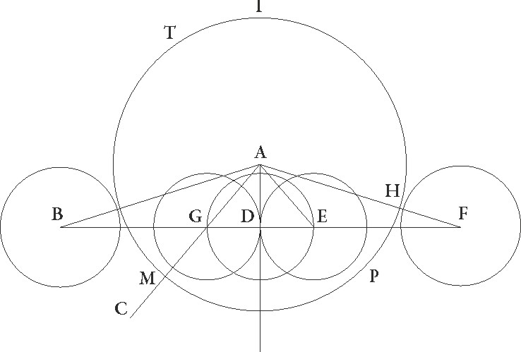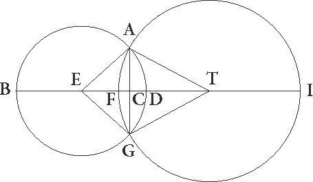 Supponatur rursum lunarium etiam eclipsium gratia in eadem descriptione lunaris quidem circulus BGD, umbre autem in media distantia circulus AFGI, et deficiat deficiat] post corr. G similiter quarta lunaris diametri pars, ut qualium est BD diameter 12, talium talium] est add. et del. A sit defectus quidem linea FDZ, umbre vero diameter secundum proportionem unius ad 2 36′ earundem 31 12′, et propterea etiam ECT linea 18 36′ colligatur. Quare circumferentia rursus lunaris quidem circuli partium fit 37 42′, umbre autem circuli 98 1′ earundem, aree quoque lunaris quidem circuli 113 6′, umbre autem circuli 764 32′ earundem colliguntur. Quoniam igitur hic, qualium est ET linea 18 36′, talium utraque quidem linearum E et EG supponitur 6, utraque vero AT et TG 15 36′ earundem, si excessum similiter quo quadratum linee TA excedit quadratum linee E