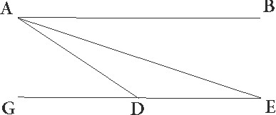 Sit ergo rursus gratia exempli AB recta linea pro arcu zodiaci in qua Solis vel umbre centrum A esse supponatur. Recta vero linea GDE sit pro arcu obliqui lunaris, et G ubi centrum Lune in medio eclipsis tempore reperiatur, D vero ubi centrum eius sit quando primo tota deficit aut primo repleri incipit, hoc est quando ab interiore parte umbre circulum tangit, E autem ubi centrum ipsius sit quando primum deficere incipit aut extremum repleri aut Sol aut Luna, hoc est quando circuli alter alterum deforis tangunt, et protrahantur AG et AD et E linee. Quod igitur BAG BAG] corr. ex ABAG G et AGE anguli quibus medium eclipsis tempus continetur recti ad sensum sint et quod BE quidem angulus tum primum deficiens tum ultimum quod repletur continet, BAD autem tum ultimum deficiens tum primum quod repletur, perspicuum est. Hinc etiam patet quod E linea rursum semidiametros utrorumque continet circulorum, AD vero excessum ipsarum.