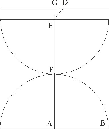 Sed gratia temporis more que in lunaribus obscurationibus invenitur sit umbre centrum in puncto A, et recta linea BGDF sit pro arcu obliqui lunaris circuli, et B quidem punctum centrum esse Lune supponatur, quando primum deforis accedens umbram tangit, G vero ubi centrum Lune futurum sit, quando primo tota deficiens ab interiori parte umbre circulum tanget, E autem ubi rursus centrum Lune sit, quando recedens primum ab interiori parte umbre circulum tangit, F autem ubi erit centrum Lune, quando tandem recedens deforis umbram tanget. Predemonstratis igitur etiam hic servatis, illud preterea patet, quod utraque linearum AG et E excessum continet quo semidiameter umbre Lune semidiametrum excedit. Quare GD transitus DE transitui equalis fit et uterque medietatem continet more et reliqua BG transitus incidentie transitui replectionis EF equalis est. Supponatur ergo eclipsis digitorum Lune quindecim, hoc est in qua D centrum interius interius] corr. ex interus G ab extremitate eclipticorum terminorum fit tota semel lunari diametro et adhuc quarta ipsius parte, idest quando AD linea utraque quidem linearum AB et AF minor est per positam lunarem diametrum semel et adhuc per quartam ipsius partem, utraque vero linearum AG et E per quartam lunaris diametri solummodo partem. Quando igitur Luna est in maxima longitudine, tunc AB linea fit dictarum sexagesimarum 56 24′ et quadratum suum 3180′ 58′′, AG vero 25 4′ earundem. Lunaris enim diameter in maxima distantia sexagesimarum est 31 20′, et quadratum eius 628′ 20′′, AD autem linea similiter 17 14′, et quadratum eius 296′ 59′′. Quare quadratum etiam linee BD relinquetur 2883′ 59′′, ipsa vero BD 53 42′ earundem per longitudinem erit, quadratum autem linee GD relinquetur 331′ 21′′, et ipsa erit per longitudinem 18 12′ earundem, reliqua etiam BG linea earundem erit 35 30′. Quare ad numerum 15 digitorum in prima lunarium eclipsium tabula in quarto quidem ordine incidentie sexagesimas 35′ 30′′, quot etiam replectionis sunt, apponemus, in quinto autem medii more temporis sexagesimas 18 ′12′′. Quando vero Luna est in minima distantia, tunc AB linea fit expositarum sexagesimarum 63 36′ et quadratum eius 4000 44′ 58′′, AG autem linea 28′ 16′′ earundem. Lune namque diameter in minima distantia demonstrata est sexagesimarum