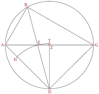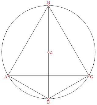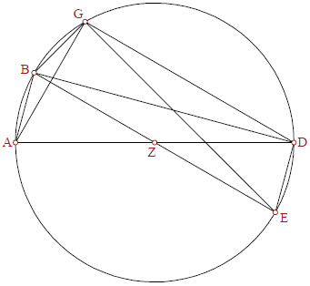 Ducit eum a puncto B diametrum BZE, et connexis lineis BD DE GE GD, consequenter dicit: Data est AB, et reliqua BD data est. Data vero est etiam BG; ergo etiam GE data est, propterea quod ea quod] add. sup. lin. M reliquum est circa BE etiam diametrum ad dimidiatum circulum. Et quoniam in circulo quadrilatera figura est GBDE, et in ea ductae sunt duae lineae diagoniae BD GE, datae, datus est locus sub BD GE, comprehensus. Datus vero etiam locus sub BG DE, et reliquus igitur sub BE GD, datus est. Et data diameter BE, etiam reliqua GD data. Vero etiam diameter AD, et AG igitur data est, quia reliqua est ad dimidiatum circulum. Dico sane quod, si utraque simul circumferentia AB et BG maior fuerit semicirculo, dabitur recta AG. Sicut in hac figura, ducta BZD diametro et connexis AD DG, quoniam BG data est, data etiam est GD. Et similiter, data BA, data est etiam AD.