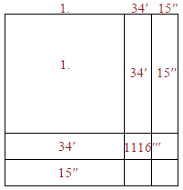 Deinde, tertiae sexagesimae, cum ad iunctis 50′′′ ex divisione quartarum, faciunt in universum 490′′′, quae faciunt 8′′ et 10′′′. Et consequenter, secundae congregatae 4094′′ faciunt sexagesimae primae 68′ et 14′′. Et eandem, primae sexagesimae coniunctae 364′, faciunt 6 partes 4′, et fiunt in universum partes 1375 4′ 14′′ 10′′′ 25′′′′. Ideo prolem, postquam addidit eos ordine, fecit additionem usque ad secundas sexagesimas, et posuit 1375 partes 4′ 14′′ proxime, tertiis et quartis neglectis.