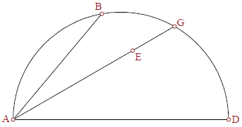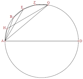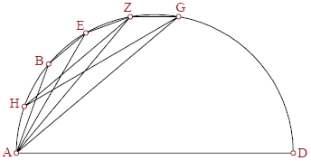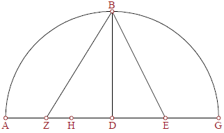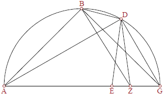 dictum est, ponutur semicirculus ABGD circa diametrum AD, et sint sumptae duae circumferentiae AB et AG, et sit AB sesquipartis, AG vero sit trium partium, et connectantur rectae AB AG, quae quidem datae et ex linearibus demonstrationibus, et sint tria intervalla inter haec duo iuxta E et Z.