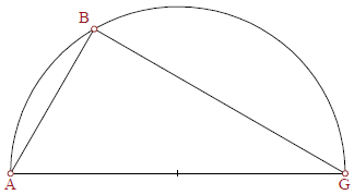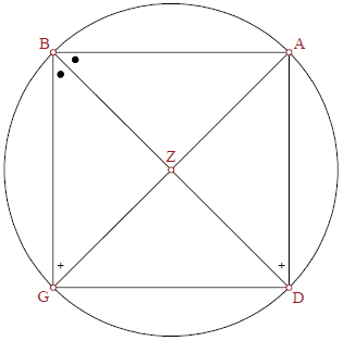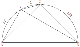 Coniungit vero rursum BD et GD, et dicit: Quia in circulo est figura quadrilatera ABGD, locus igitur qui ab AB BD, enim recto angulo includitur aequalis est ambobus, et ei qui ab AB GD, et ei qui ab AD BG. Et quoniam datae sunt AB et AG, datae sunt ergo et BD GD, eo quod sunt reliquae ad dimidiatum circulum. Data etiam est AD diameter. Datae igitur sunt hae quinque: AB AG BD GD AD.