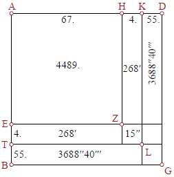 Quoniam igitur numerus quadrati 4500, qui rationale latus habet, est integrarum partium 4489 (ex latere 67), auferatur ab ABGD quadrato AZ quadratum partium 4489, cuius latus est partium 67. Erit reliquus gnomon BZD partium 11, quas si resolvimus in primas sexagesimas, 660 ponemus. Deinde, si duplicaveri veri] add. sup. lin. Mmus EZ (quia bis fit rectangulum ex EZ) quasique in directum lineae EZ linea ZH sumentes, dividemus primas sexagesimas 660 per 134 ex duplatione factas, et sexagesimis primis 4 ex divisione factis, habebimus utrumque latus ET HK. Et si impleverimus TZ ZK parallelogramma, habebimus ea 536 primarum sexagesimarum, aut unumquodque eorum 268. Post rursum, si reliquas 124 sexagesimas primas resolverimus in sexagesimas secundas 7440, et auferemus supplementum ZL 16 secundarum sexagesimarum, ut si addimus gnomonem priori quadrato HZ, habeamus AL quadratum ex latere 67° 4′, congregatum 7497° 56′ 16′′, et reliquum rursum BL LD gnomomem partium 2 3′ 44′′ (hoc est, 7424′′). Ulterius ergo, si rursum duplicaverimus TL lineam, quasi in directum lineae TL lineam LK, et per 134° 8′ 8′] add. sup. lin. M, diviserimus 7424′′ sexagesimas secundas, sexagesimis secundis 55′′ factis ex divisione proxime, habemus proxime unumquodque laterum TB KD. Et si compleverimus BL LD parallelogramma, habebimus et eadem sexagesimis secundis quidem 7377′′ et 20′′′; unumquodque autem secundis 3688′′ et 40′′′. Remanent vero et secundae sexagesimae 46′′ et 40′′′, quia quia] add. sup. lin. M quidem proxime constituunt LG quadratum ex latere 55′′, et habemus latus ABGD quadrati, quod est partium 45†…†67 4′ 55′′ proxime. Et universaliter: si quaesiverimus alicuius numeri tetragoni cum latus, accipiamus primo latus numeri quadrati prope; deinde latus ipsum duplamus, et per numerum provenientem dividimus reliquum numerum resolutum in primas sexagesimas; a numero ex divisione facto subtrahimus quadratum, et rursum resolvimus reliquas in sexagesimas secundas, et dividimus per duplum partium et sexagesimas. Habebimus numerum lateris superficiei quadratae quaesitum proxime.