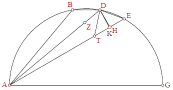 Quoniam enim recta AB aequalis est recta AT, communis vero AD, duae BA AD, duabus TA AD, aequales sunt, et angulus BAD angulo EAD est aequalis et angulus BAD angulo EAD est aequalis] add. i. m. M (quia circumferentia BD aequalis est circumferentiae DE). Igitur basis BD basi et aequalis est. Sed et BD aequalis est DE rectae; igitur etiam DE est aequalis rectae DT. sed et BD aequalis est DE, rectae igitur etiam DE est aequalis rectae DT] add. i. m. M Ideoque, triangulum DET est aequalium crurium, et anguli ad T T] corr. ex D M et E sunt acuti. Et quoniam recta AD aequalis est rectae AH, quarum AZ recta est aequalis rectae AT, reliqua igitur DZ reliquae TH est aequalis. Rursum, quoniam recta AD est aequalis rectae AH, angulus igitur sub ADH est aequalis angulo sub AHD; uterque igitur est acutus. Et quoniam angulus sub AHD acutus est, sed et angulus ad T, igitur recta a signo D ad rectam TE perpendiculariter ducta est est del. M inter puncta T et H cadet. Sit DK. Et quoniam in triangulo aequalium crurium DTE a vertice ad basim perpendicularis ducta est, secat basim per aequalia. Aequalis igitur est recta TK rectae KE. Maior igitur est TM (hoc est, ZD) quam HE. Et est ZD quidem excessus rectae AD ad AB, recta vero HE excessus est rectae AE ad AD. Igitur minorum rectarum excessus maiores sunt circumferentiis continue aequaliter crescentibus. Demonstrabimus etiam quod rectae quae subtendunt circumferentias maiores LX partibus numero sunt maiores quam circumferentiae earum, quae vero maiores circumferentias minores. Si hoc ipsum manifestum est ex theoremate ab ipso prius demonstrato. Sit enim circulus ABGD, et in eo sint ductae duae rectae, scilicet AB, quae subtendat circumferentiam XXX partium, AG vero subtendat circumferentiam LX partium. Et quoniam recta AG ad rectam AB minorem habet rationem quam circumferentia AG ad circumferentiam AB, circumferentia vero ABG dupla est circumferentiae AB. Igitur recta AG maior est quam dupla rectae AB, et