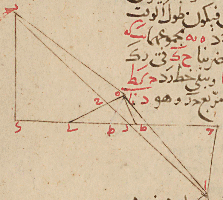 شيئًا بقي د نو وهو عديل لشيءٍ واحدٍ فخطّ ب ح هو د نو ويبقى ا ح ي ي. امتحانه: أخذنا مربّع ب ح الذي هو د نو فجاء كد ك ىو ومربّع ه ح كان ا نر لو مجموعهما كو ىر ىب جذره ه ح وهو خطّ ب ه وأخذنا مربّع ا ح الذي هو ي ي فجاء ا مج كا م زدنا عليه مربّع ه ح بلغ ا مه ىط ىو جذره ي ىو وهو خط ه ا وبكونه ضعف خطّ ب ه عرفنا صحّة العمل، ولمعرفة خطّ ح ي ضربنا فضل ا ح الذي هو ي ي على ا ز الذي هو ح مح وهو خطّ ح ز ومقداره ا كب في ا ج وهو د ك حصل ي ا ك قسّمناه على ج د وهو د نا حصل ي ح ولمعرفة خطّ ز ي ضربنا في الأصل: ن. ز ح وهو ا كب في ا ز وهو ح مح حصل ىب ا كو قسّمناه على ج ز وهو د نا خرج ب كط وهو خط ز ي وإذا أردنا ح ي وهو ب د على ه ح وهو ا كد حصل خطّ ه ي وهو ج كح ولمعرفة ه ط ضربنا خطّ ه ي وهو ج كح في ج ز وهو د نا حصل ىو مح مح وقسّمناه على ا ز وهو ح مح حصل ا نه وهو ه ط عرض الزهرة. ولمعرفة ي ط ضربنا ا ج وهو ز ك في ه ي وهو ج كح حصل كه كه ك قسّمناه على ا ز وهو ح مح خرج ب نج وهو خطّ ط ي وكان ج ز د نا و ز ي ب كط فيكون ج ي ز ك وإذا نقصنا منه ي ط وهو ب نج بقي ج ط د كد وهو بُعد طول الزهرة عن ا فإن كان طول ا على ما في الكتاب و لو كان طول الزهرة ىا ج وكان عرضه ا نه فخرج الطول زائدًا على ما أخذه بطلميوس بسبع وعشرين دقيقة والعرض زائدًا على ما أخذه بخمس وعشرين دقيقة فعرفنا أنّه قد تساهل فيه وعمل على التّقريب دون التّحقيق والله ملقن الصدق والصواب.