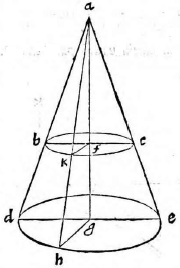 Sit conus cuius vertex punctum A, basis circulus BC, intelligaturque conus produci et secari plano ipsi BC circulo aequidistanti, ut sit sectio in superficie coni linea DE. Dico ipsam DE circulum esse, qui centrum habet in axi. Sit enim F centrum circuli BC, et ducta AF producatur usque ad secans planum in G; erit AG coni axis. Itaque secetur conus plano per axem ducto, et sint plani secantis et aliorum planorum communes sectiones rectae lineae BC, DE. Sumatur praeterea in linea DE quodvis punctum H, et iuncta GH rursus per ipsam et per axem ducatur aliud planum secans circulum BC in linea KF; erunt rectae lineae BC, DE et KF, HG aequidistantes, quoniam plana aequidistantia esse posuimus. Quare et ipsa ABF, ADG,