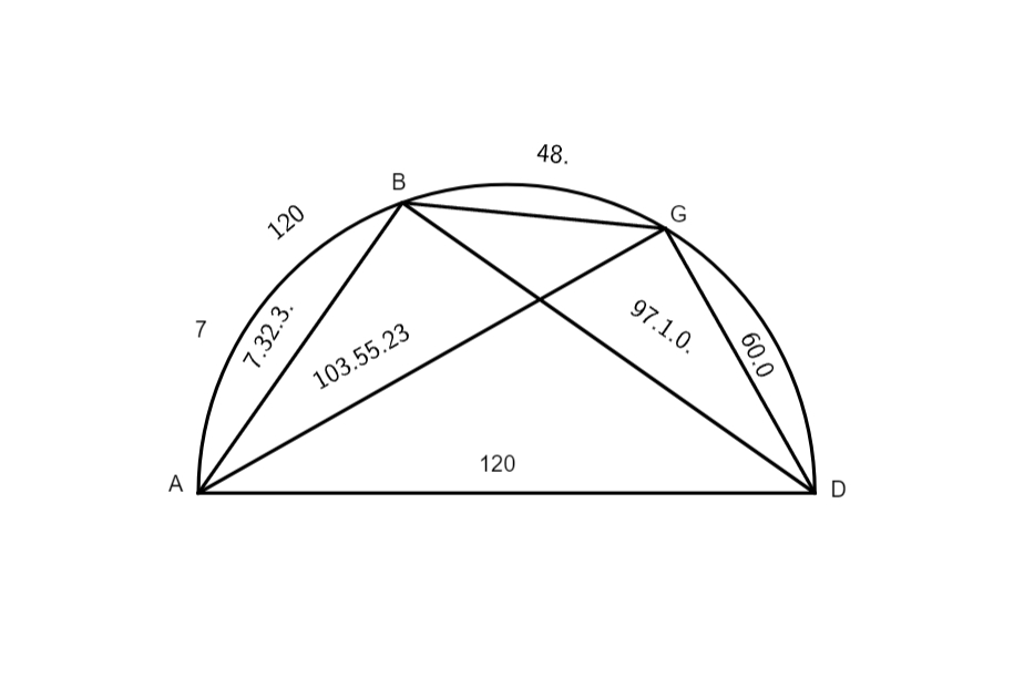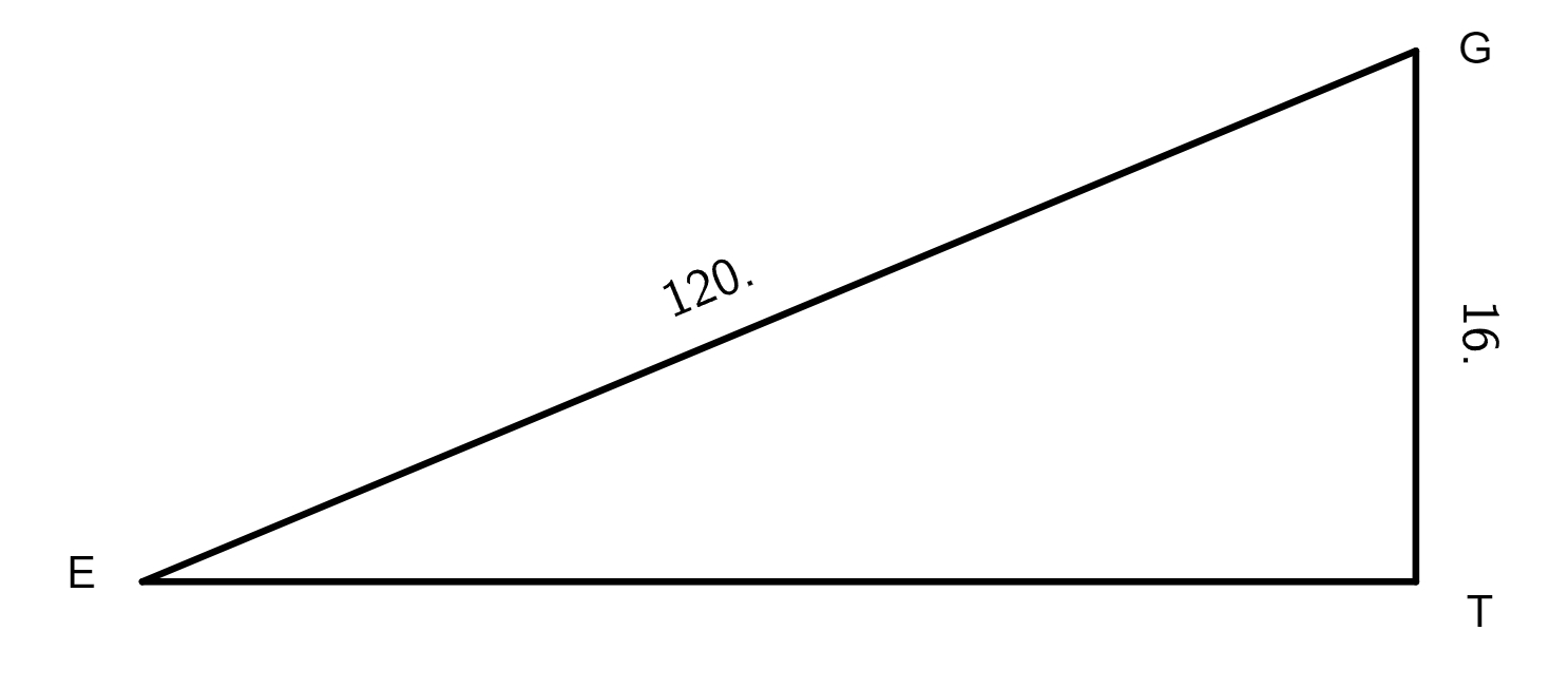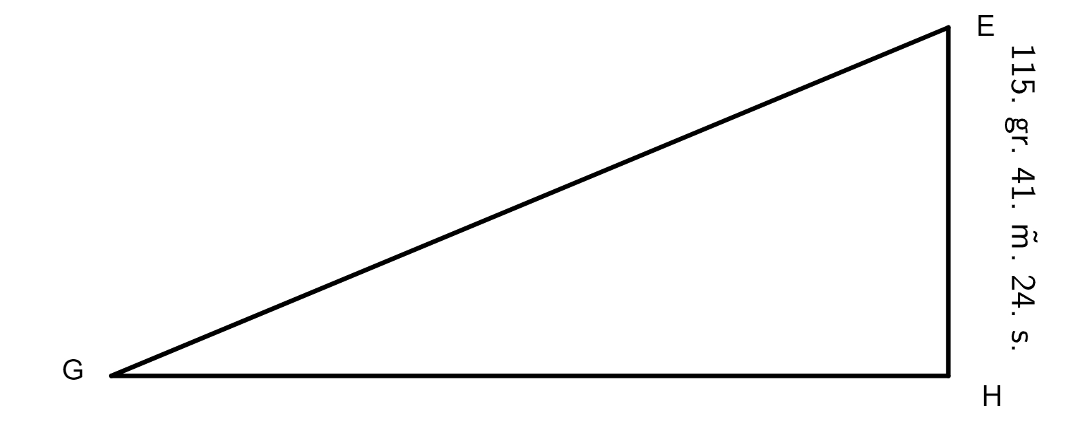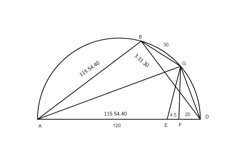 In hoc triangulo GET, latus EG notum est ex praemissis, quod est 1 gradus 20 minutorum 23 secundarum, et similiter angulus GET, qui est 96 graduum 51 minutorum, quem si subtraxeris a duobus rectis, relinquentur pro angulo TGE 83 gradus 9 minuta. Chordae arcuum horum angulorum sunt 89 gradus 46 minuta 14 secundas et 79 gradus 37 minuta 55 secundas. Nunc ordinatis his numeris in regulam ut sequitur:
