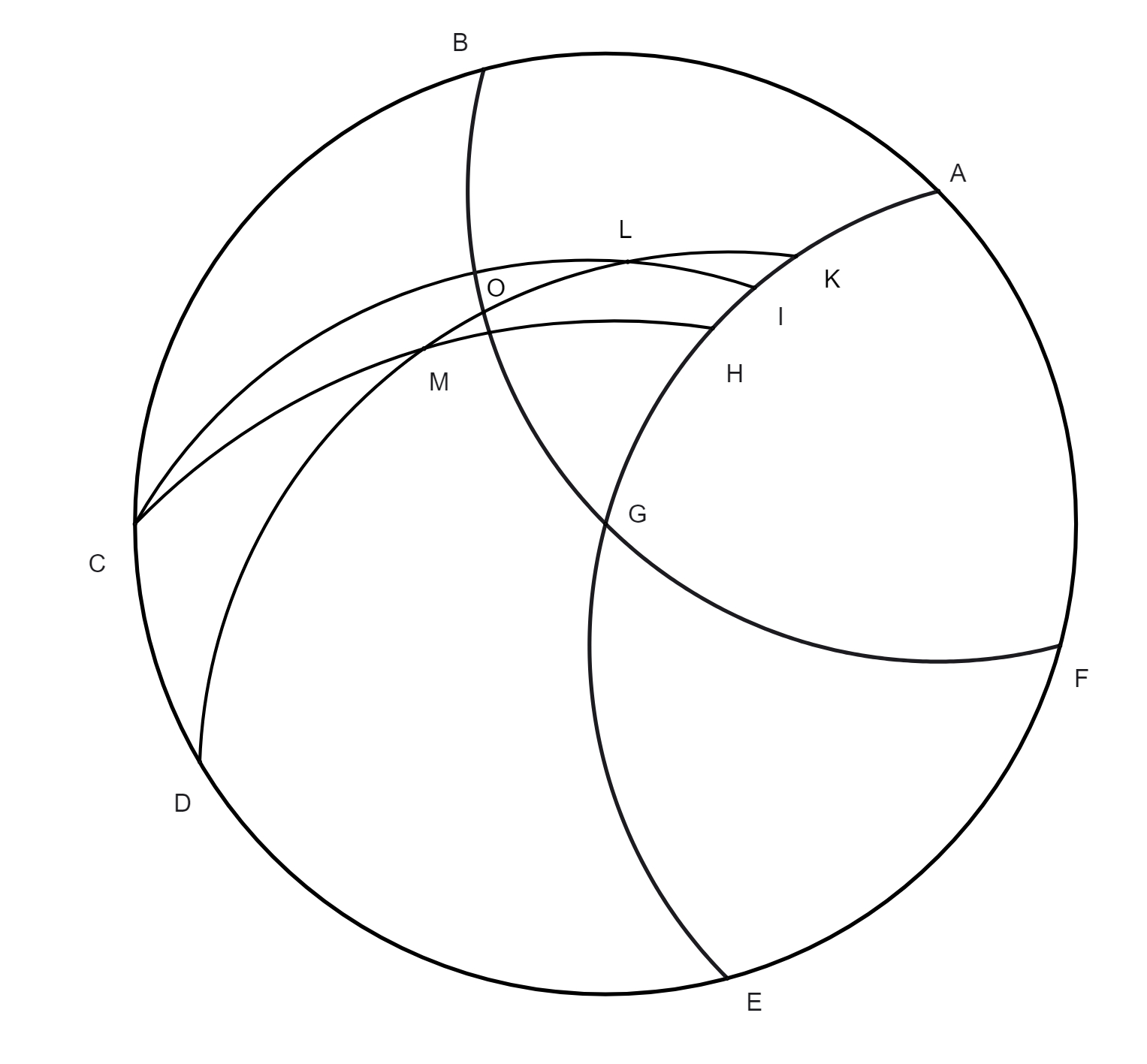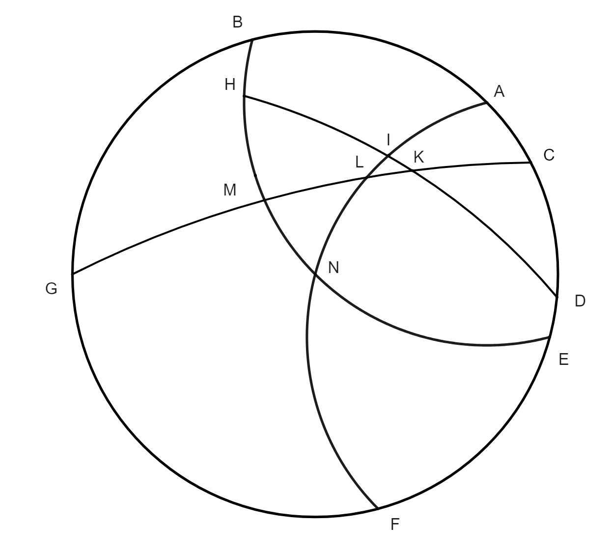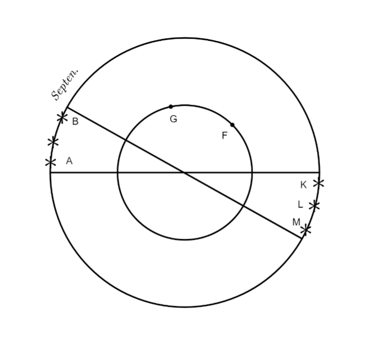 In hoc exemplo non aliter operati sumus quam in superiori, nempe resolutis numeris more solito, ductus est sinus dupli arcus AD in sinum dupli arcus KL, productum divisum est per sinum dupli arcus DK, quod ex eiusmodi divisione nascebatur iterum ductum est in sinum dupli arcus CH, quod hinc provenit divisum est per sinum dupli arcus AC, et prosilierunt nobis 28° 40ʹ 49ʹʹ, sinus scilicet dupli arcus LI, huius sinus arcus inventus est 27° 39ʹ, cuius dimidium sunt 13° 49ʹ, arcus scilicet LI. Tanta est declinatio quaesita, quae etiam septentrionalis est, cum arcus OL sit minor arcui OLK. Si vero arcus OL fuerit maior arcu OLK, tunc alia est via quaerendi declinationem, cuius rei etiam propriam figuram cum exemplo adducere visum est. Esto circulus ABF colurus solstitiorum, BNE semicirculus zodiaci, ANF medietas aequinoctialis, polus zodiaci sit punctus C, aequinoctialis autem D punctus, et transeat maximi circuli pars per polum zodiaci, quae sit CLMG, et similiter transeat pars maximi circuli per polum aequinoctialis D, et stellam, aut alium punctum coeli scilicet, per punctum K, qui in hoc loco supponitur quae sit DKIH. Quia autem a puncto A descendunt duo arcus AL et AD, a quorum extremitatibus