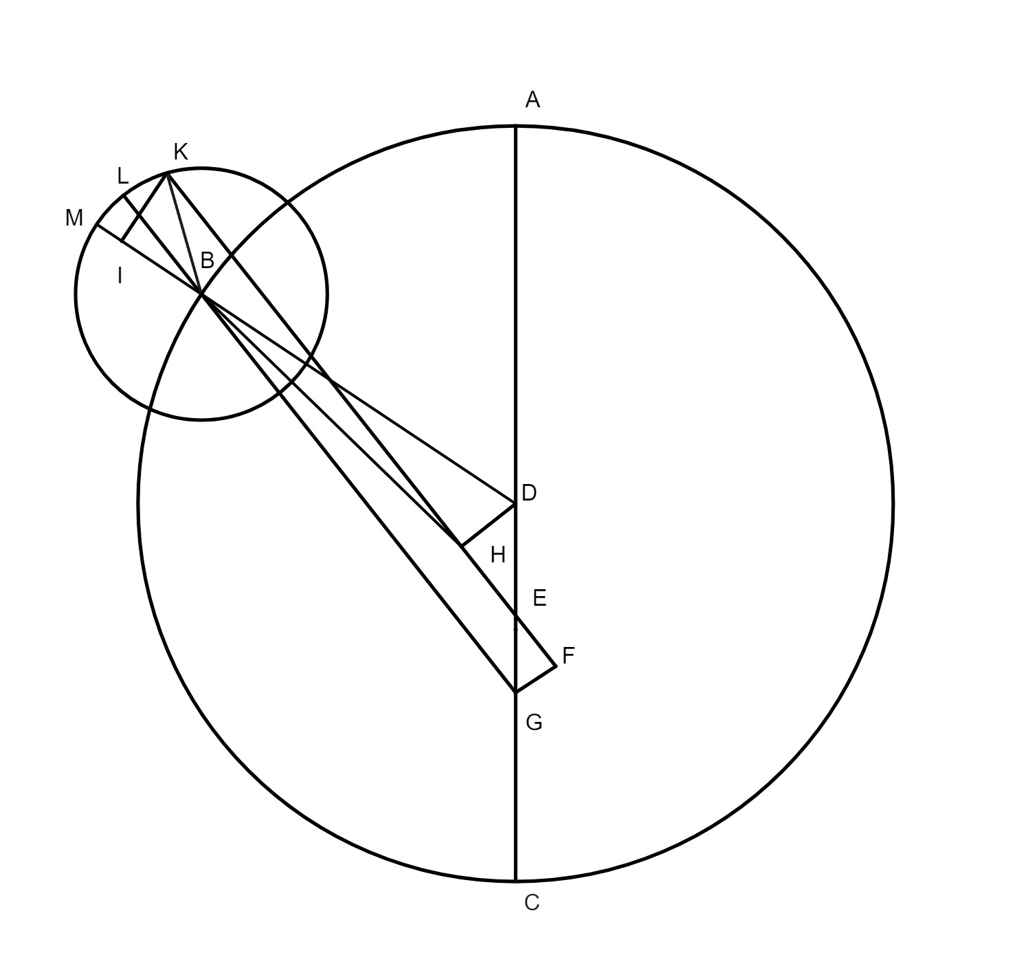 epicycli, MLK epicyclus qui defertur a puncto A versus punctum B secundum ordinem signorum, GL sit linea medii longitudinis epicycli, centrum Lunae moveatur a puncto M versus punctum K contra ordinem signorum, K sit locus Lunae, LK mediae longitudinis arcus, seu argumentum medium, ut nostri loquuntur, MLK arcus veri argumenti, angulus MBL sit angulus aequationis centri seu duplicis distantiae, punctus A sit maxima longitudo in excentrico, AB duplex distantia, quae praesupponitur in hoc exemplo esse 48 graduum. Ad inquirendum angulum MBL, cui aequalis est GBF per decimamquintam primi, hac via processimus, scilicet cum arcus AB sit datus dabitur etiam angulus AEB, qui est 48 graduum in triangulo, DEH est unus ex angulis acutis datus, cum uno latere scilicet DE, duplicatis 48 gradibus prodierunt 96°. Subtractis illis a semicirculo habuimus pro angulo HDE 84 gradus, horum angulorum arcuum subtensae fuerunt, scilicet, DH 89° 10ʹ 39ʹʹ, HE 80° 17ʹ 45ʹʹ. His numeris ordinatis modo supra dicto, et facta operatione, prodierunt pro latere DH 7° 40ʹ et pro latere HE 6° 54ʹ, quorum DE est 10 graduum 19 minutorum, et ut habeamus lineam BF duximus semidiametrum excentrici BD, qui est supra inventus 49° 41ʹ, in se, et lineam DH in se, et quadratum DH sublatum est a quadrato BD, et radix eius quod relinquebatur erant per penultimam primi 49° 5ʹ. Tanta fuit linea BH, cui adiecta est linea HE, scilicet 6° 54ʹ, et exiit linea BE 55° 59ʹ; et cum EF sit aequalis lineae HE, iterum addidimus 6° 54ʹ ipsis 55° 59ʹ et habuimus totam lineam BF 62° 53ʹ. Haec linea ducta est in se, et similiter linea GF, cui aequalis est HD, cum HE et EF sint aequales, harum linearum quadrata composita faciunt per penultimam primi quadratum lineae BG, cuius radix nobis inventa est 63 gradus 21 minuta proxime. In triangulo GBF sunt duo latera nota, per doctrinam triangulorum dabitur angulus GBF quem, redactis numeris in ordinem suum et operatione solita absoluta, invenimus esse 6 graduum 58 minutorum fere, hic cum duplex distantia sit minor sex signis seu semicirculo, addendus venit arcui LK in epicyclo, quem praesupponimus 36 graduum, et fuit totus arcus MLK 42 graduum 58 minutorum. Nunc porro restat inveniendus MEK. In triangulo acuto IBK est unus angulus notus, scilicet angulus B, cum uno latere BK, quod est 5° 15ʹ; ad habenda latera BI, IK non aliter pergantur quam in inventione laterum DH, HE. Subtensa dupli arcus in K est 81° 47ʹ 19ʹʹ et subtensa arcus trianguli IKB est 87° 47ʹ 16ʹʹ. Post operationem, ut fieri solet, provenerunt pro latere IK 3° 34ʹ 41ʹʹ et pro IB 3° 50ʹ 20ʹʹ, et postquam addidimus 3° 50ʹ 20ʹʹ ipsis 55° 59ʹ, hoc est lineam IB lineae EB, nata est tota linea IE 59° 49ʹ 20ʹʹ, qua ducta in se, et similiter linea IK, et compositis duobus quadratis ac inde elicita radice, fuit linea KE inventa esse 59° 55ʹ 40ʹʹ. His habitis, restabat inveniendus angulus IEK, quem omnibus rite absolutis in operatione de inveniendo aliquo angulo duobus lateribus in triangulo supposito notis, invenimus 3 gradus 25ʹ. Tantus, inquam, est angulus aequationis in EK, hoc est argumenti, cum argumentum fuerit 42 graduum 58 minutorum. Cum vero Ptolemaeus ipsemet adduxerit exemplum, quando duplex distantia sit maior una quarta excentrici, hic de hac re cessandum censuimus, in qua licet multa adhuc requirantur, tamen ne prolixiores simus quam aequum est, reservabimus ea donec prodeant a nobis alia in hunc autorem. Haec arbitramur non inutilia futura incipientibus in hoc autore, etiam ad ea quae sequuntur de reliquis planetis. Nunc ad reliqua de quibus paucula dicere statuimus, nempe de quibusdam propositionibus octavi libri: nam manifestum est quod ratio declinationum sit in triplicis forma, scilicet aut latitudo est septentrionalis et similiter declinatio, aut latitudo est meridionalis et declinatio septentrionalis, aut latitudo et declinatio sunt simul meridionales; ut res evidentior et clarior sit adducemus tria exempla, in quibus ad oculum ponemus quomodo hae tres rationes inter se distent. Haec exempla duplici via calculari possunt aut per doctrinam triangulorum sphaericorum, aut per regulam sex quantitatum.