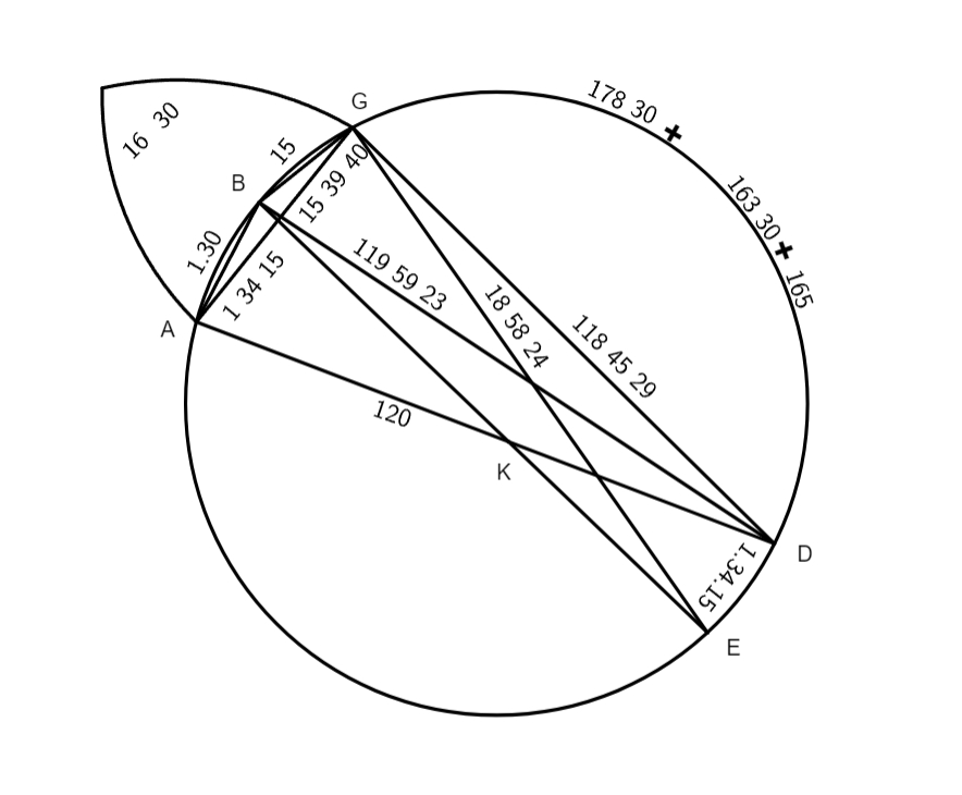 GE ad AE. Nam si duxeris 5° 25ʹ in 120° et diviseris productum per 16°, nascentur 39 gradus 22 minuta pro linea GE; si adieceris ei lineam EA, hoc est 60°,