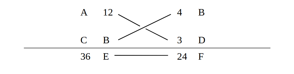 Postea, duc terminum secundum in terminum primum superioris rationis, quod nascitur sit tibi numerus secundus, numerus ad quem quaesitum proportionatur sit numerus tertius, quo facto, operare ut supra. Si vero libuerit operari per praxim sex quantitatum, operare iuxta sensum regulae quae docet quintam quantitatem invenire. Ad inveniendum arcus ita procedas. Subtrahe arcum maximae declinationis a 90 gradibus, productum dupla, et habebis arcum FB et arcum duplum BA, scilicet arcum maximae declinationis Solis. Deinde accipe declinationem dati arcus EI, eam dupla et productum subtrahe a 180 gradibus et relinquetur arcus FI pro sexto arcu, ad quem proportionatur arcus ET qui quaeritur; accipias arcum EA, cuius duplum est 180 graduum. Reliqua per exemplum praecedens manifesta sunt. In quo arcus FB et arcus AB manent invariabiles. Sed priusquam accedas ad operationem, quaeras omnium arcuum chordas e tabula chordarum, deinde ordines omnia ita ut vides in hoc praecedenti exemplo, in quo proposuimus 88 gradus zodiaci, quorum ascensionem rectam quaerere decrevimus.