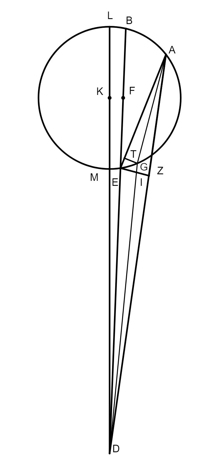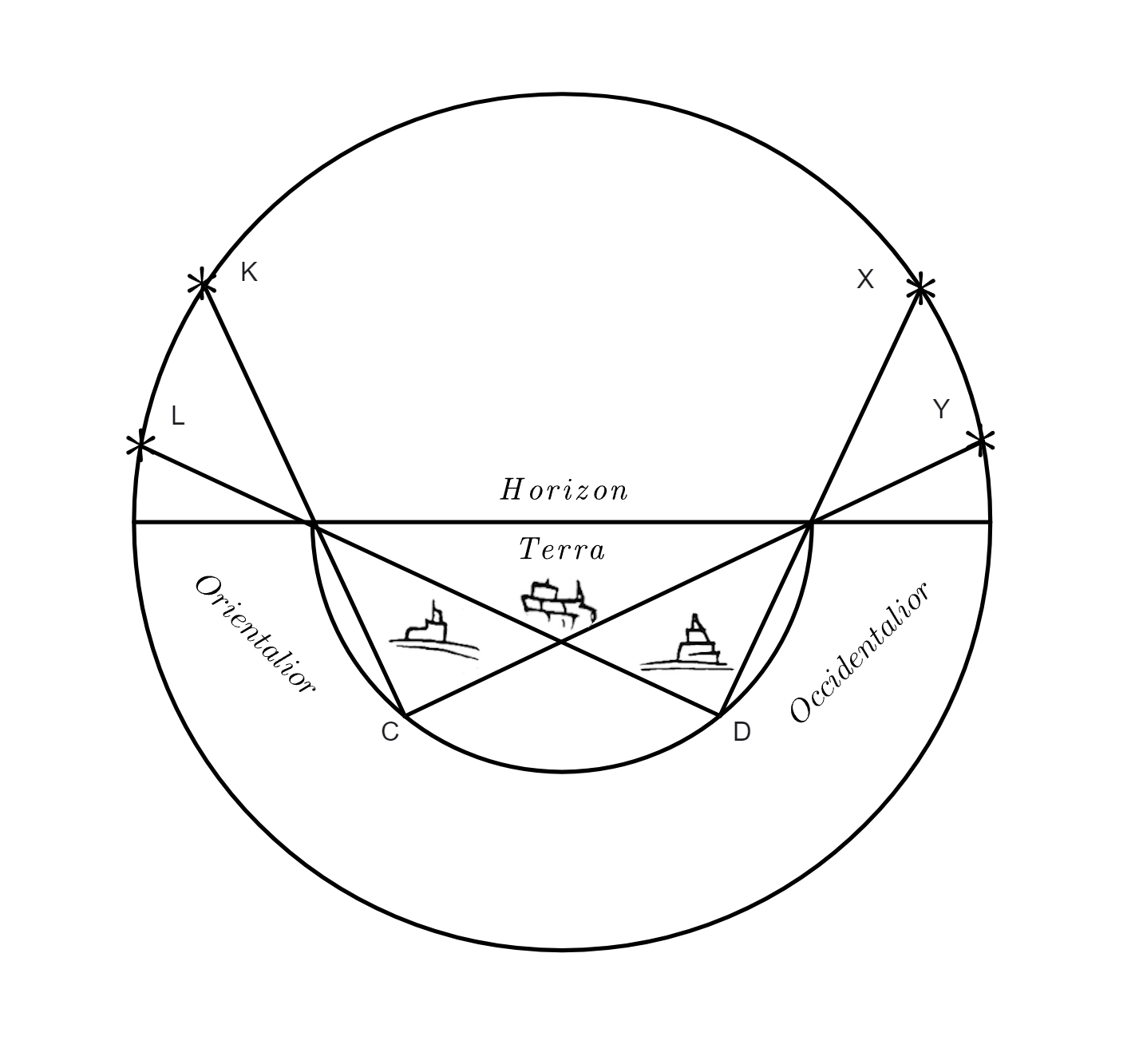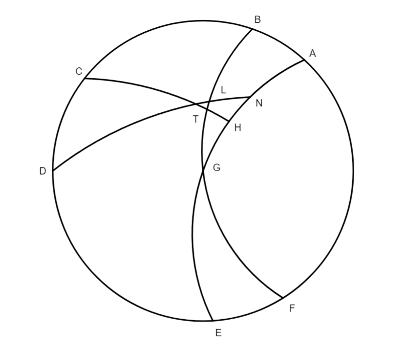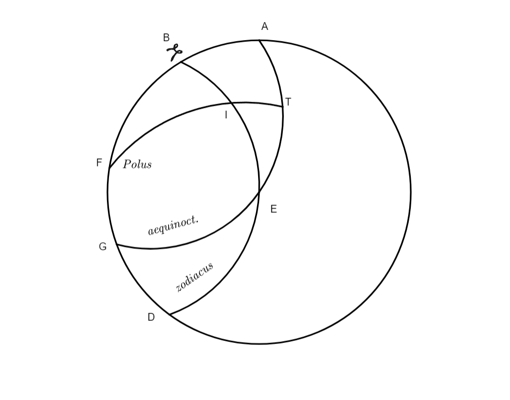 ABE colurus solstitiorum, sicut supra. Nunc animus est quaerere punctum H, cum quo stella ad medium coeli venit, seu arcum GH. Cum arcus GL fuerit 47°, latitudo TL 6°, GN 49° 28ʹ, TH 22° 42ʹ, proportio CD ad DA componitur ex duabus proportionibus CT ad TH et HN ad NA. Sed quinque horum nota sunt, scilicet duplus arcus DC, qui est 47°, et eius chorda 47° 51ʹ et duplus arcus DA 113° cum sua chorda, quae est 110° 2ʹ 50ʹʹ. Porro duplus arcus declinationis stellae TH notus est, cum suo complemento, scilicet CT, complementum est 134° 36ʹ et chorda sua 110° 42ʹ 9ʹʹ, et declinatonis arcus TH ex superioribus notus est, qui est duplus 45° 24ʹ, et chorda sua est 45° 55ʹ 42ʹʹ, et arcus NA est notus, qui est complementum arcus GN, quem supponimus duplum 81° 4ʹ, et eius chordam 77° 59ʹ 12ʹʹ. Horum arcuum numeros sic ordinavimus: