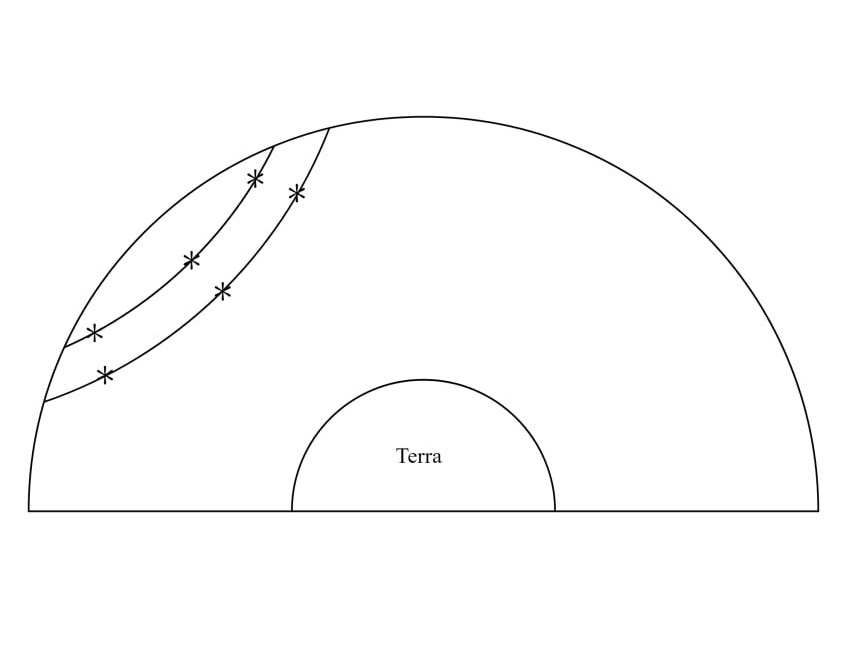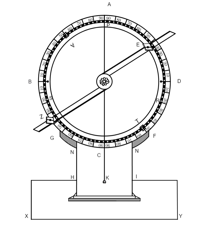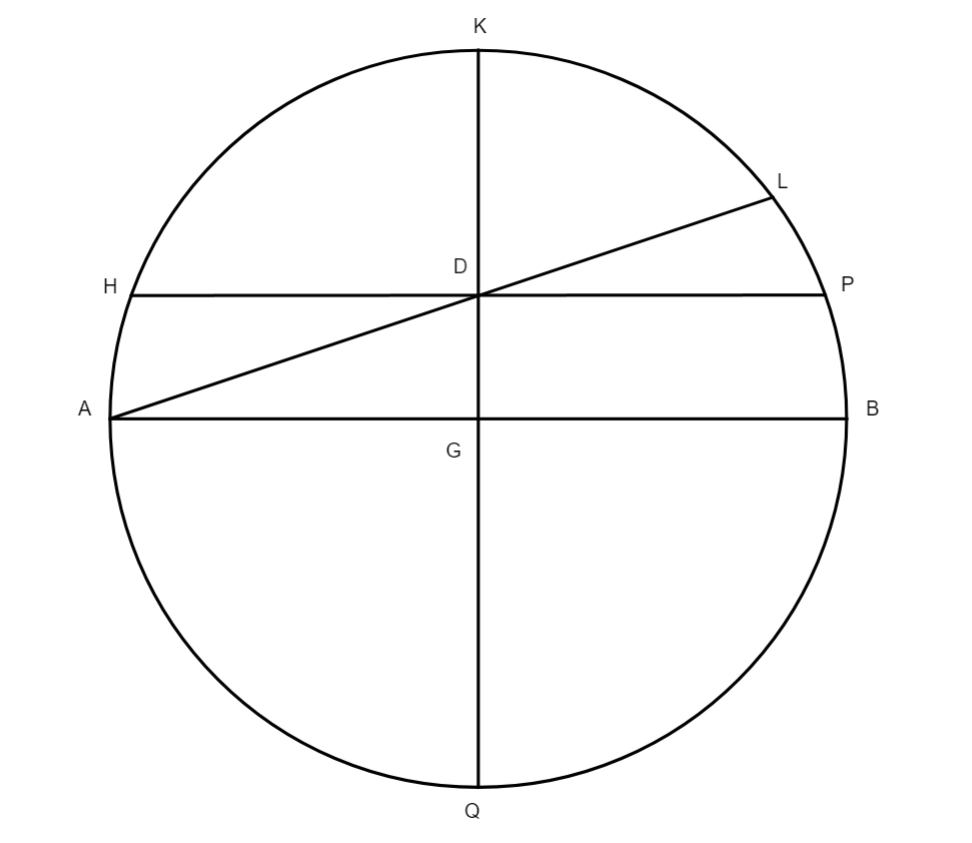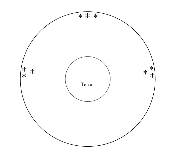 ABE colurus solstitiorum, sicut supra. Nunc animus est quaerere punctum H, cum quo stella ad medium coeli venit, seu arcum GH. Cum arcus GL fuerit 47°, latitudo TL 6°, GN 49° 28ʹ, TH 22° 42ʹ, proportio CD ad DA componitur ex duabus proportionibus CT ad TH et HN ad NA. Sed quinque horum nota sunt, scilicet duplus arcus DC, qui est 47°, et eius chorda 47° 51ʹ et duplus arcus DA 113° cum sua chorda, quae est 110° 2ʹ 50ʹʹ. Porro duplus arcus declinationis stellae TH notus est, cum suo complemento, scilicet CT, complementum est 134° 36ʹ et chorda sua 110° 42ʹ 9ʹʹ, et declinatonis arcus TH ex superioribus notus est, qui est duplus 45° 24ʹ, et chorda sua est 45° 55ʹ 42ʹʹ, et arcus NA est notus, qui est complementum arcus GN, quem supponimus duplum 81° 4ʹ, et eius chordam 77° 59ʹ 12ʹʹ. Horum arcuum numeros sic ordinavimus: