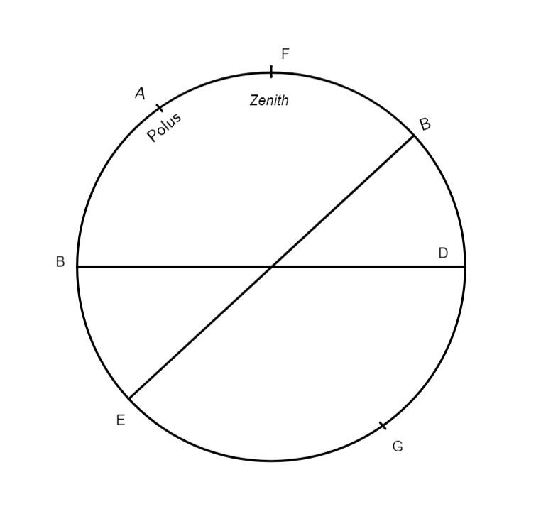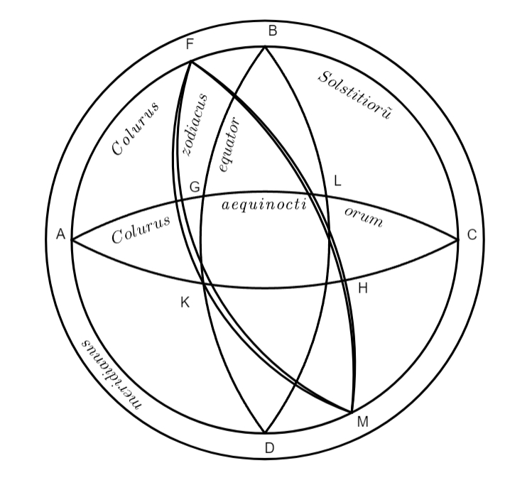 Sit ABCF colurus solstitiorum, BGF medietas circuli qui est per medium signorum, AGE medietas aequinoctialis, C