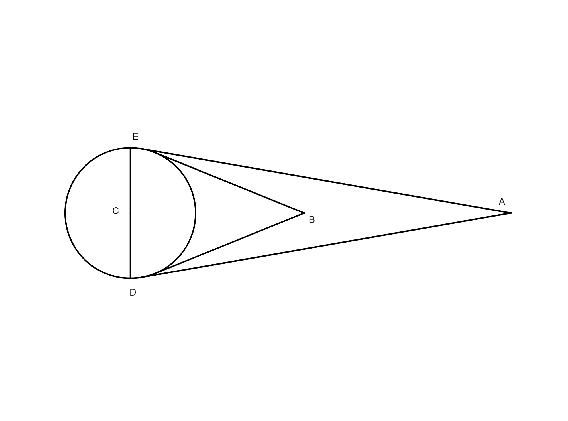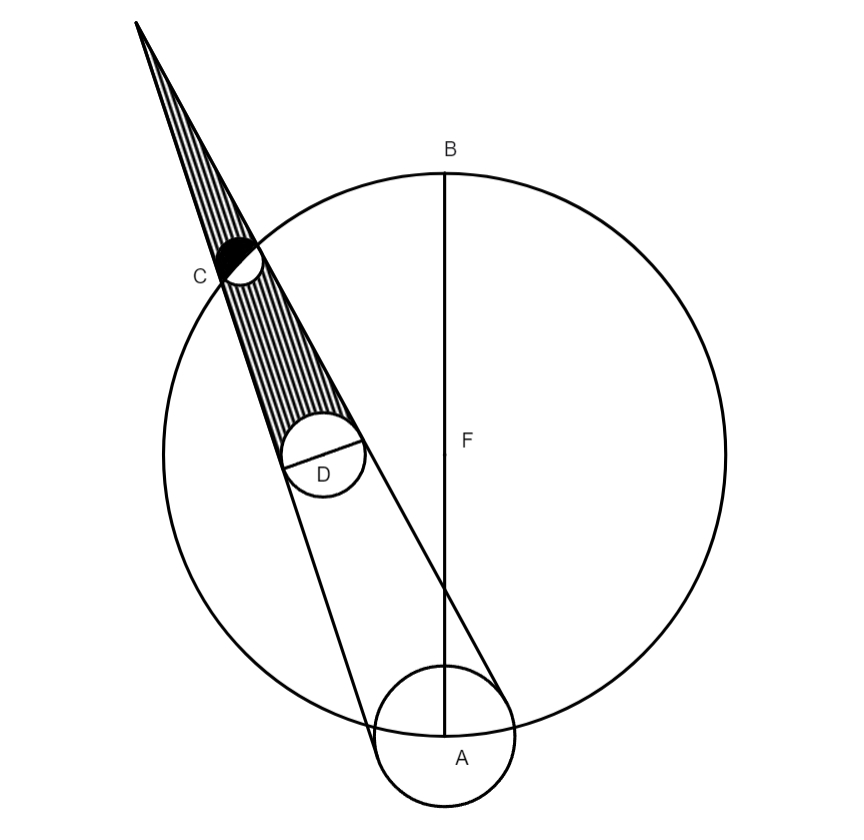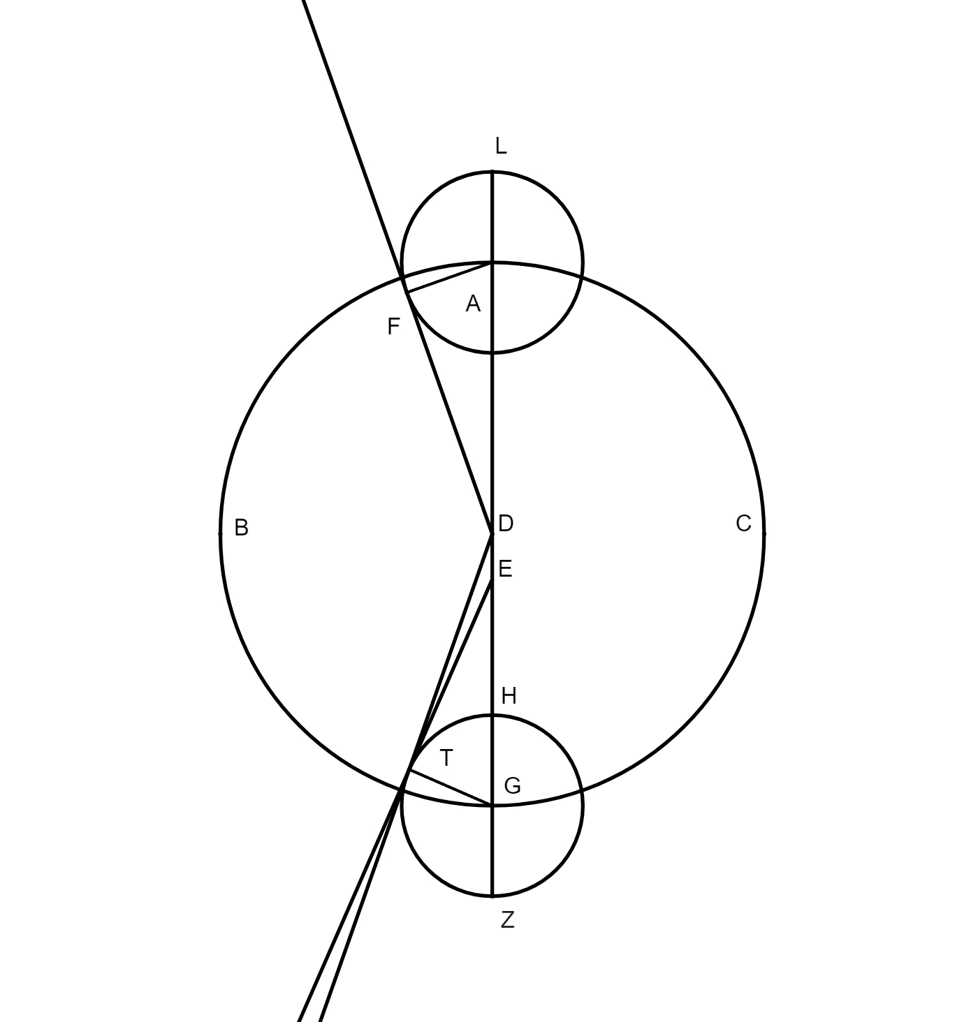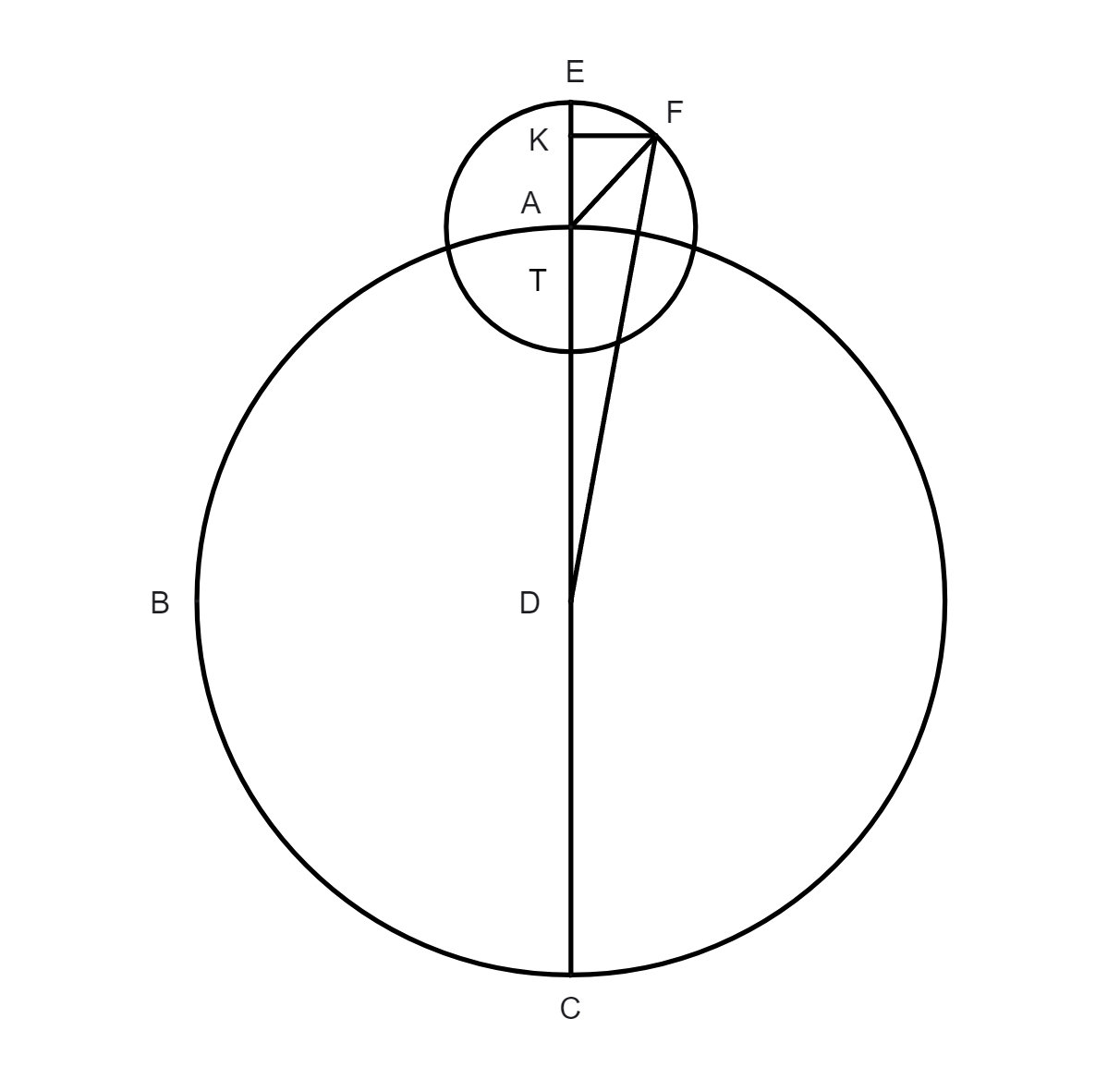 centro mundi hoc modo. Esto ABGC deferens excentricus epicycli, E centrum mundi, D centrum excentrici, ET contingens epicyclum propiorem centro mundi et EF contingens epicyclo remotiorem a centro mundi. Ductis lineis TG et AF, nunc quaerimus quantitatem lineae DE. Cum angulus TEG sit notus, erit proportio TG ad GE nota. Sed ex supradictis nota est proportio lineae AF ad EA, hinc GE ad EA nota erit, et hoc per quartam sexti, sed chorda arcus TG est 16° proxime, quae est igitur proportio TG ad FA ea est proportio
