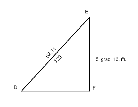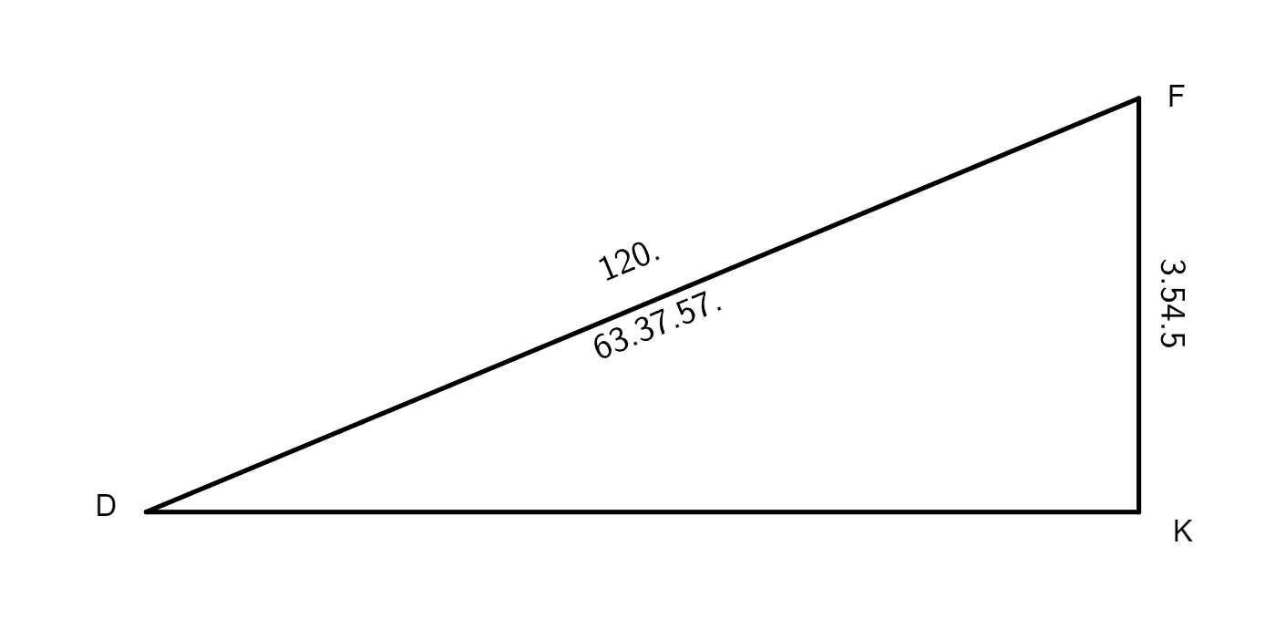 semidiametro excentrici, scilicet AD, hoc est 60 gradus, et fuit tota linea KD 63 gradus 30 minuta 46 secundae. Hanc lineam multiplicavimus in se et productum notavimus seorsim, quo facto, multiplicavimus etiam lineam KF in se, haec duo producta composita sunt per penultimam primi, et prodiit quadratum lineae DF, cuius radix fuerunt 63° 37ʹ 57ʹʹ. His habitis, perreximus ad inventionem FDK anguli, in quo duo latera sunt cognita, ordinavimus igitur numeros ad regulam secundum doctrinam triangulorum planorum ad hunc modum: 63° 37ʹ 57ʹʹ | 120° | 3° 54ʹ 5ʹʹ, et absoluta operatione provenerunt pro latere KF 7 gradus 21 minuta 26 secundae, quorum arcus fuit 7 graduum 6 minutorum fere,